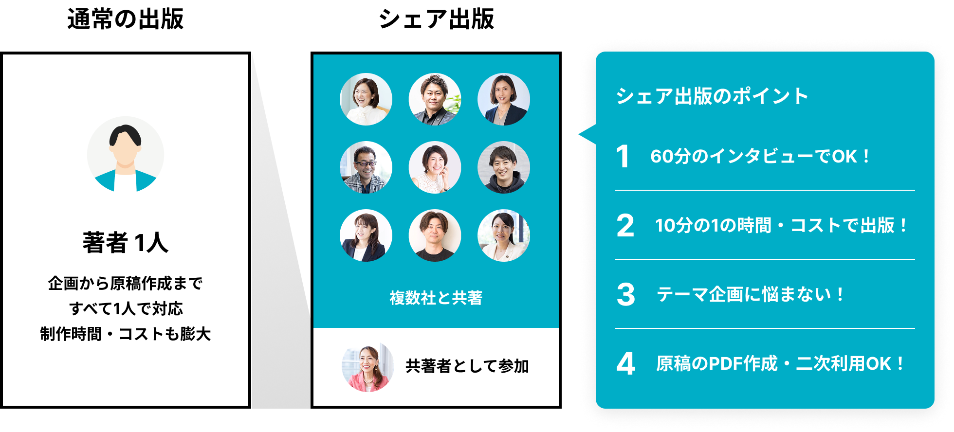 費用や作業負担を共著者間でシェアすることで、通常の単著出版に比べて低コスト・省工数を実現できます。