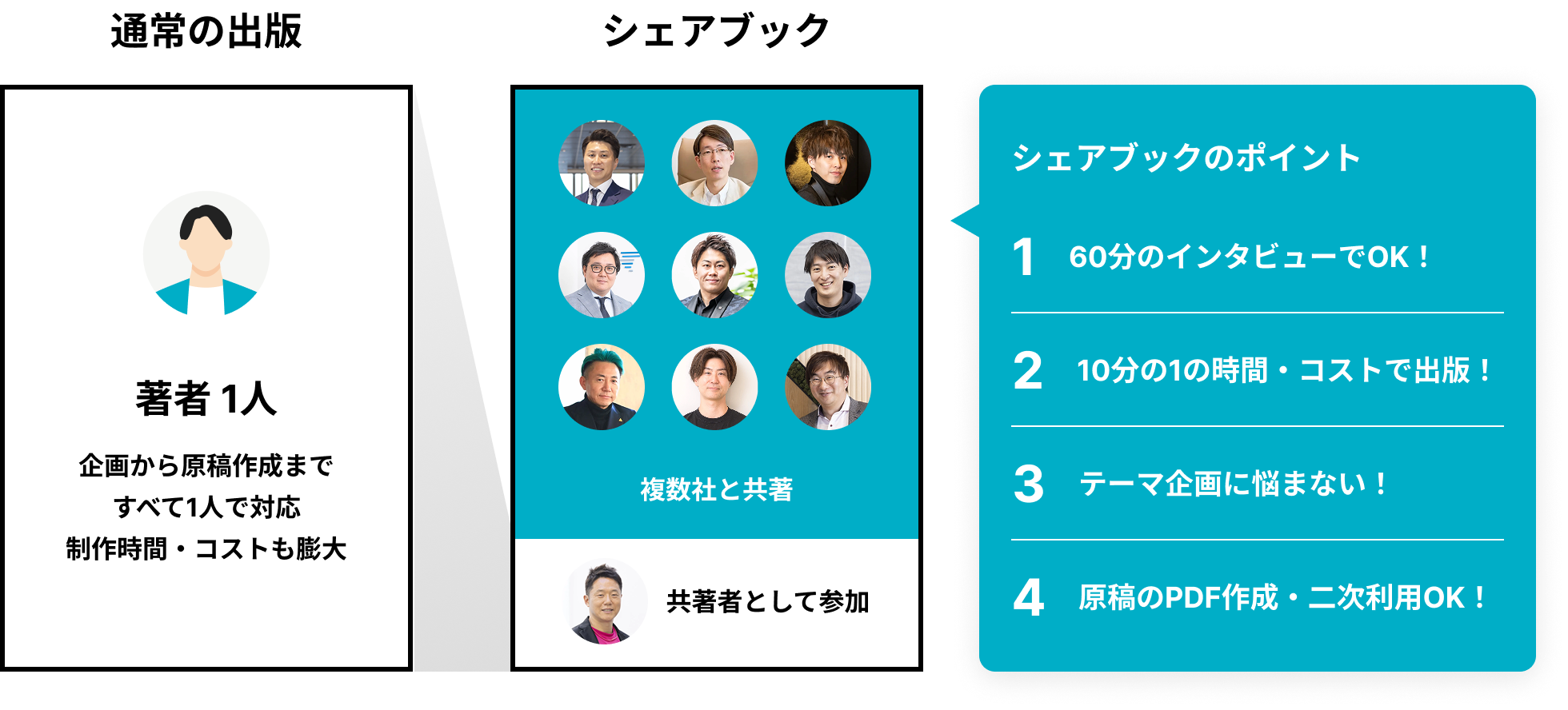 共著型出版は、短時間・低コストで書籍化ができるだけでなく、Web・SNSと連動した発信が可能なため、営業・採用・広報などあらゆる場面で活用できます。共著という形で共感とつながりを生み出せるのも、今の時代に合った新しい出版の形です。